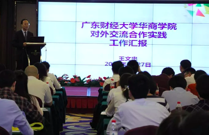 会议安排了暨南大学、广州中医药大学、深圳职业技术学院、广东财经大学华商学院的代表向大会汇报了各自对外交流合作的特色和经验。华商学院国际交流处处长王文忠介绍了华商学院的国际化特色项目:中外学分互认项目及学生长、短期赴境外交流项目,包括与澳洲国际商学院合作的赴澳商业艺术梦想之旅项目、雅思强化培训团、创新创业及领导力培训项目、国际青年商业精英计划、华为认证网络工程师培训项目、南航杯营销方案创意大赛等。
